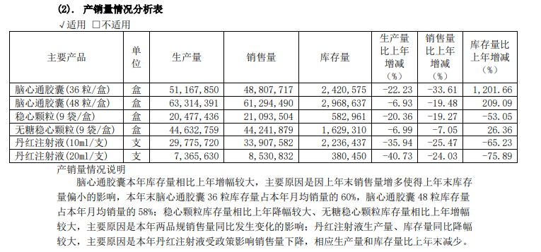 從財報數據來看,步長製藥早期推出的腦心通膠囊、穩心顆粒和丹紅注射液三款明星單品,在2021年都出現產銷量的同步大幅下滑。如丹紅注射液10ml/支的主力規格銷售量比上年下降25.47%,規格為20ml/支的銷量也比上年下降24.03%。