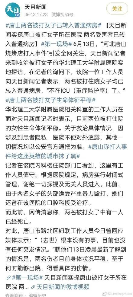 天目新聞去採訪唐山被打女子所在醫院,工作人員表示兩名被打女子已經轉入普通病房,不在ICU了。