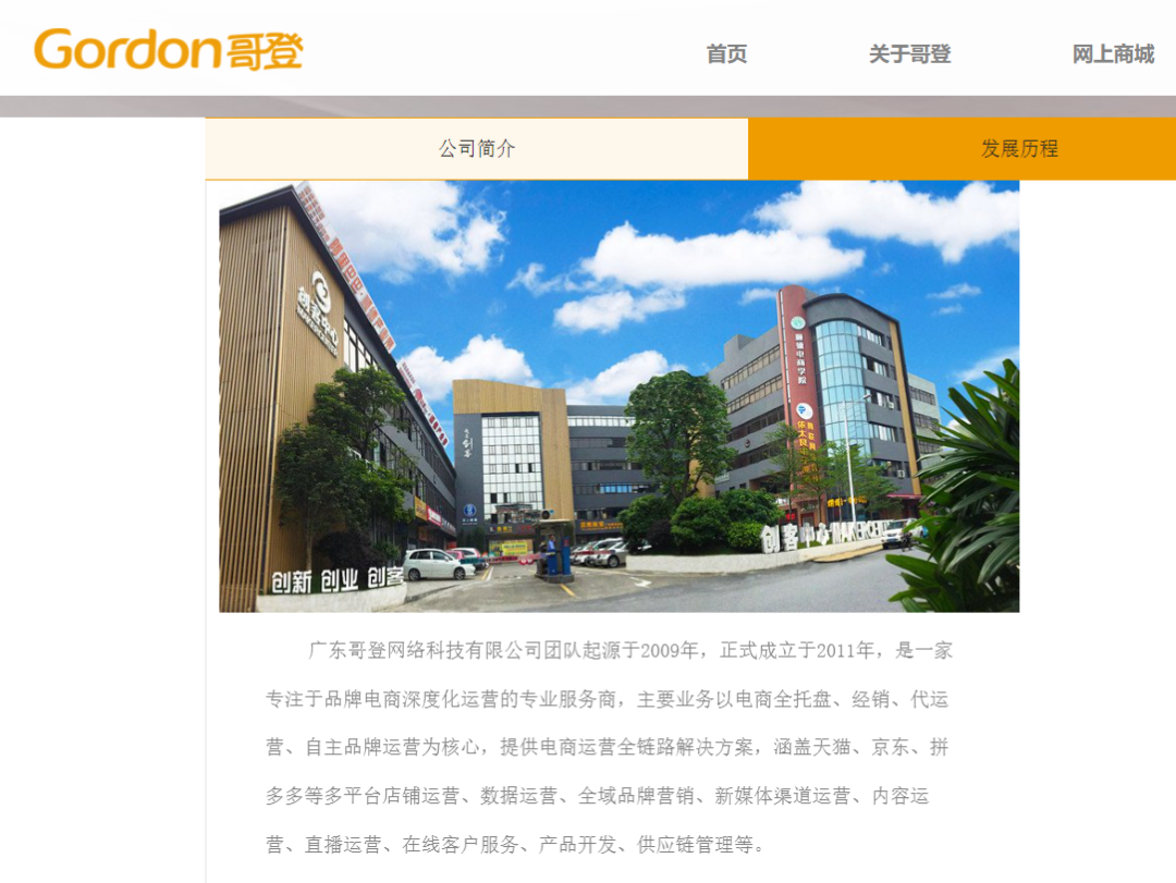 正如其官網上的簡介所説,“廣東哥登網絡科技有限公司團隊起源於2009年,正式成立於2011年,是一家專注於品牌電商深度化運營的專業服務商,主要業務以電商全託盤、經銷、代運營、自主品牌運營為核心,提供電商運營全鏈路解決方案。”