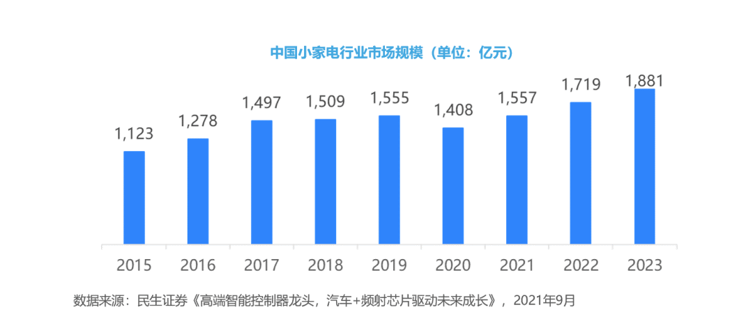 疫情期間出現的居家隔離情況的確給空氣炸鍋、破壁機等小家電產品再添了一把火,小家電產品自帶的多功能、易操作及時尚簡潔的外觀符合當下年輕人對於精緻、健康、便捷的生活方式的追求。據前瞻產業研究院的數據顯示,截至2020年末,我國小家電行業市場規模較2013年增長123.34%至4,536.00億元,且近三年增速保持在12.00%以上。