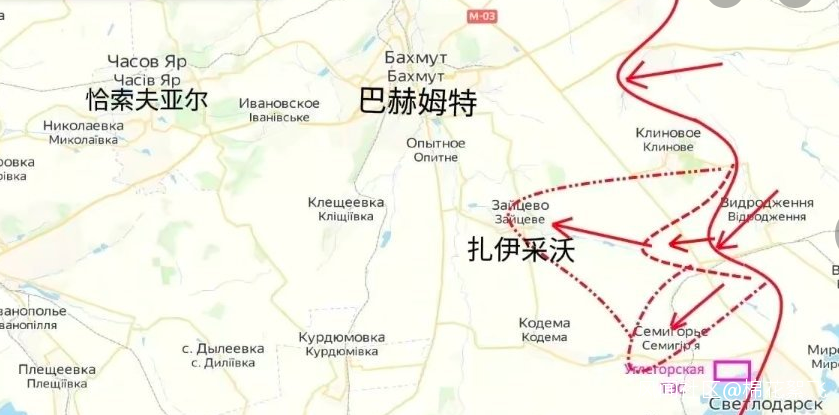 戰爭就是量變到質變,就像拔河比賽,一開始一般都是勢均力敵,後來有一方沒了力氣,就輸了,這個比喻聽懂了就懂戰爭的過程了。所以不要老問我什麼時候能拿下哪裏,什麼時候能贏得勝利,目前都是在量變的過程。後面的關注重點就是M03公里,巴赫穆特到斯托維亞斯克之間的公路,黃線備註