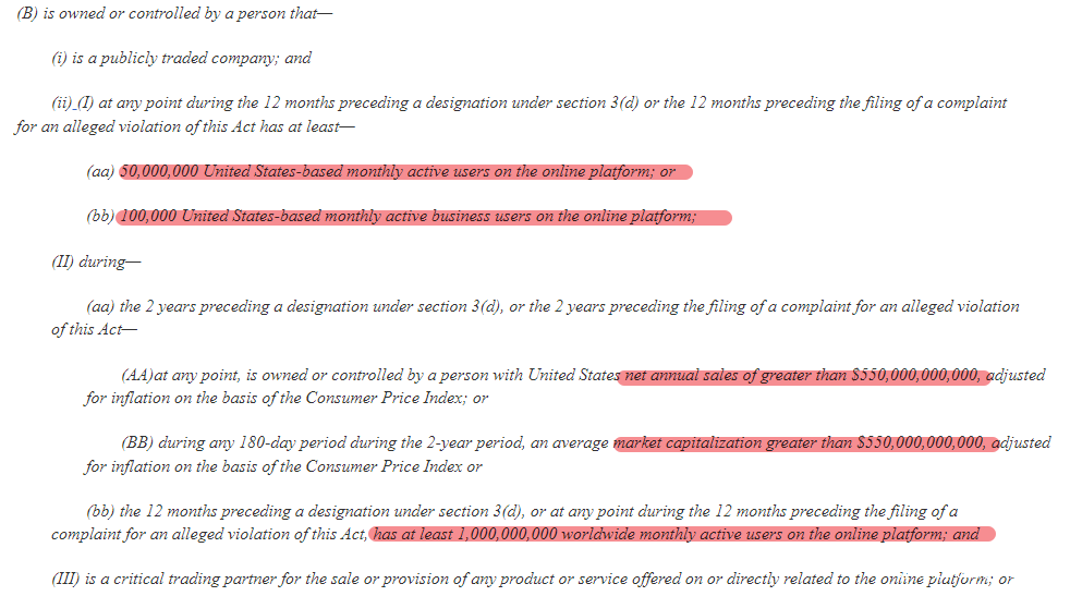 一個是市值或銷售額要有5500 億美元( 按照最近的通貨膨脹率可能要漲到6000 億美元 )以上,或在美月平均活躍用户在 5000 萬以上的平台公司。