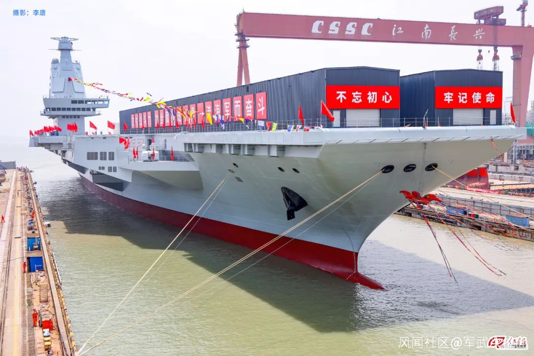 6月17日,中國海軍首艘平甲板、安裝有電磁彈射器的003型航空母艦,在上海江南造船集團3號船塢舉行了下水儀式。隨後,003型航空母艦將被拖帶到舾裝碼頭,繼續展開舾裝工作。