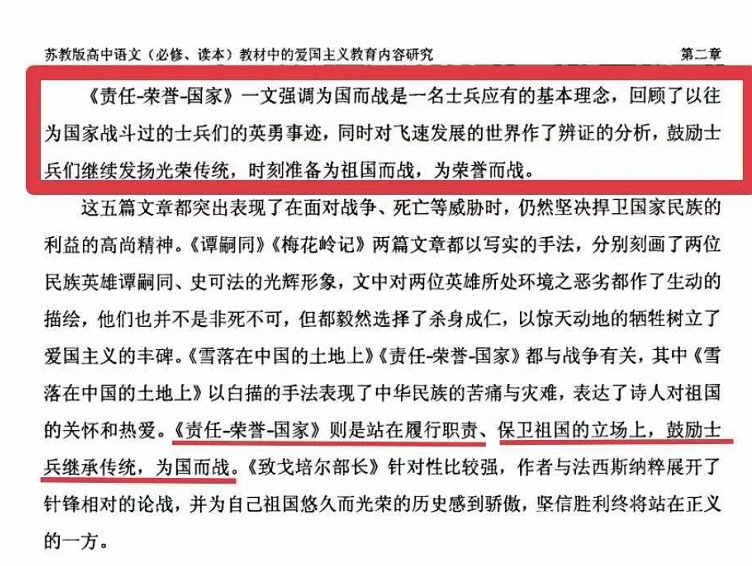 在《蘇教版高中語文(必修、讀本)教材的愛國主義教育研究》論文中,還把這篇文章當作“愛國主義教育”的典型大加讚賞。