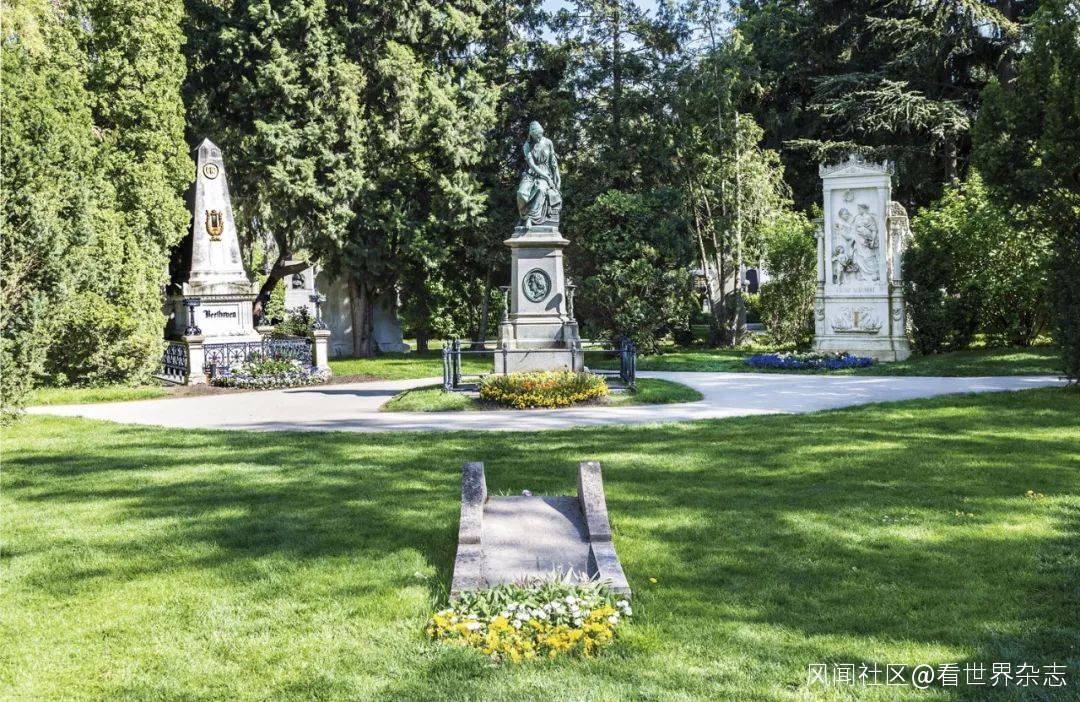 在“音樂之都”維也納,中央公墓裏的音樂家墓區自然不能少。作為榮譽墓地,今天在墓園裏“彼此為鄰”的音樂家們的墓碑,也是從別處遷來的。貝多芬與舒伯特的墓於1888年遷至此地。不僅如此,勃拉姆斯、薩列裏、施特勞斯家族以及勳伯格,也並非從一開始就安葬在中央公墓。