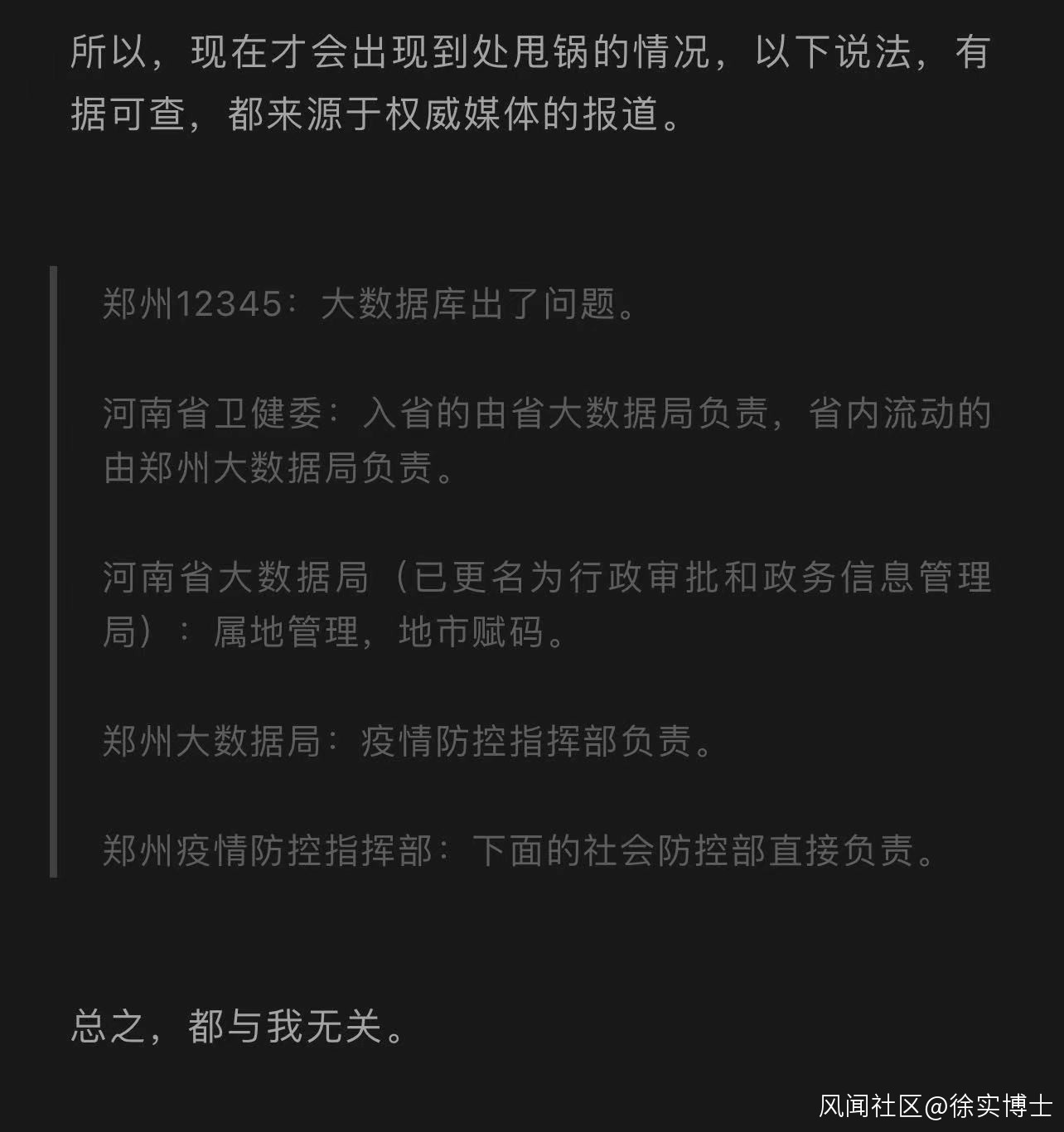 紅碼事件發酵之後,出現了更為魔幻的情節:當社會各界聲討河南省的政府機構之時,各部門紛紛踢皮球、競相撇清關係。一時間,竟然沒人能説清河南省的健康碼到底由哪家機構、哪個團隊來管理。