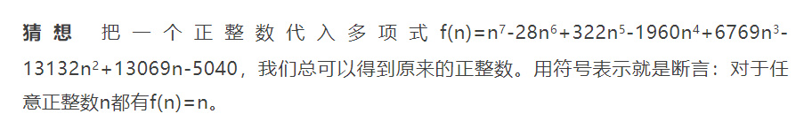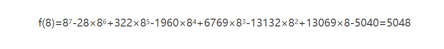 這是真的嗎?顯然,我們可以代入幾個正整數看一看有什麼結果。當 n=1 時,我們得到f(1)=1-28+322-1960+6769-13132+13069-5040=1,顯然斷言成立。如果我們代入n=2,計算結果為