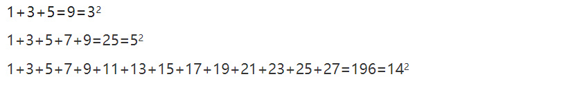 一些經驗提示我們,無論把這個加法進行到什麼時候,其結果總是完全平方數。例如,