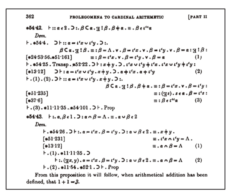 圖 1 羅素和懷特海證明1+1=2丨摘自艾爾弗雷德·諾思·懷特海和伯特蘭·羅素於 1910 年合寫的《數學原理》的第 1 卷。劍橋大學出版社惠允
