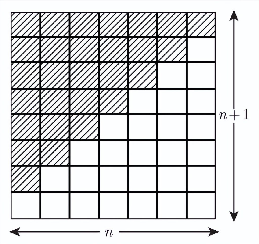一句話,這個證明是優雅的。但是,如果它是我們尋找的那種優雅,那麼圖3則給出了另一個更短的證明,一個無言的證明。這裏奇數是一個方塊、三個方塊、五個方塊,以此類推,按特殊方法排列。我們從左下角的一個方塊開始,三個有陰影的方塊包圍着它形成一個2×2 的正方形,五個沒陰影的方塊包圍着前面這些方塊形成一個 3×3 的正方形,接下來就是七個有陰影的方塊包圍着前面這些方塊形成一個 4×4 的正方形,以此類推。這張圖示清楚地表明從 1 開始的連續奇數的和總是產生一個(幾何的)平方。這個證明非常自然。早在 2000 年前古希臘人就知道它了,現代的後輩可以通過構建方塊模仿這一證明。