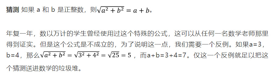 數學中有一個非常嚴酷的現實:為了證明一個一般的陳述需要一個一般的推理;但為了反駁它,只需要一個特殊的例子,一個使這個陳述失敗的例子。後者稱為反例,一個好的反例價值如金。例如,假設我們有下面的猜測。