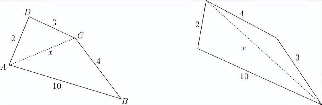 我們假設的四邊形如圖4 所示。畫出虛線所示的對角線,它把這個四邊形分成兩個三角形,並設 是這條對角線的長度。第 G 章(古希臘幾何)已經説明過,歐幾里得證明了三角形的任意一條邊小於其他兩條邊的和。因此在△ABC 中,我們知道10<4+x。同樣在△ADC 中,有x<2+3。把這兩個不等式結合起來得到
