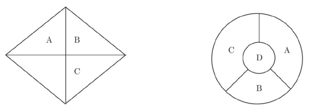 四色猜想誕生於 1852 年,在接下來的一個世紀裏引起了廣泛的關注。有幾個問題很快就被解決了,比如任何平面地圖肯定可以用五種顏色着色,還有就是用三種顏色着色地圖是不充分的。圖 7就給出了這樣的一個地圖。在這張圖上,我們必須使區域 A、B 和 C 有不同的顏色,因為它們每對都有共同的邊界,但是接下來,除非使用第四種顏色,否則不可能給區域 D 着色。