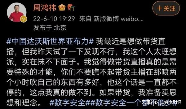 這幾天,俞敏洪的雙語直播帶貨火了,分享了一些心得給周鴻禕。6月10日,周鴻禕參加亞布力中國企業家論壇,説自己也想要帶貨直播,試了一下,發現抹不開面子。