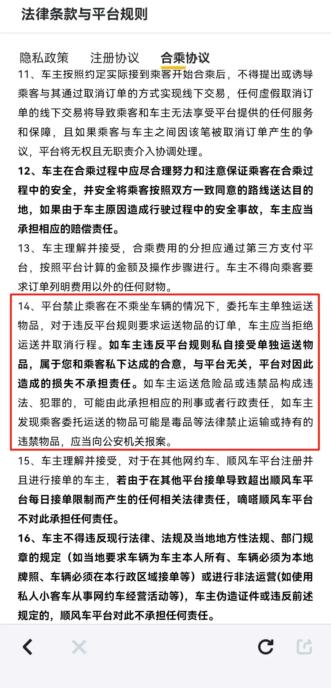 對此,AI藍媒匯翻看了嘀嗒平台的規則,其中有提到:“平台禁止乘客在不乘坐車輛的情況下,委託車主單獨運送物品,對於違反平台規則要求運送物品的訂單,車主應當拒絕運送並取消行程。”