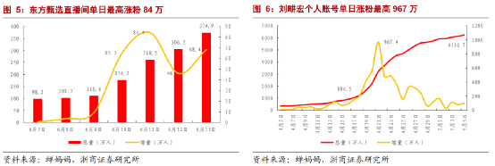 截至 6 月 13 日,東方甄選直播間的粉絲數量為 374.9 萬,較 6 月7 日漲粉 276 萬,一週漲粉近 3.7倍,與劉畊宏直播間粉絲曲線高度相似。
