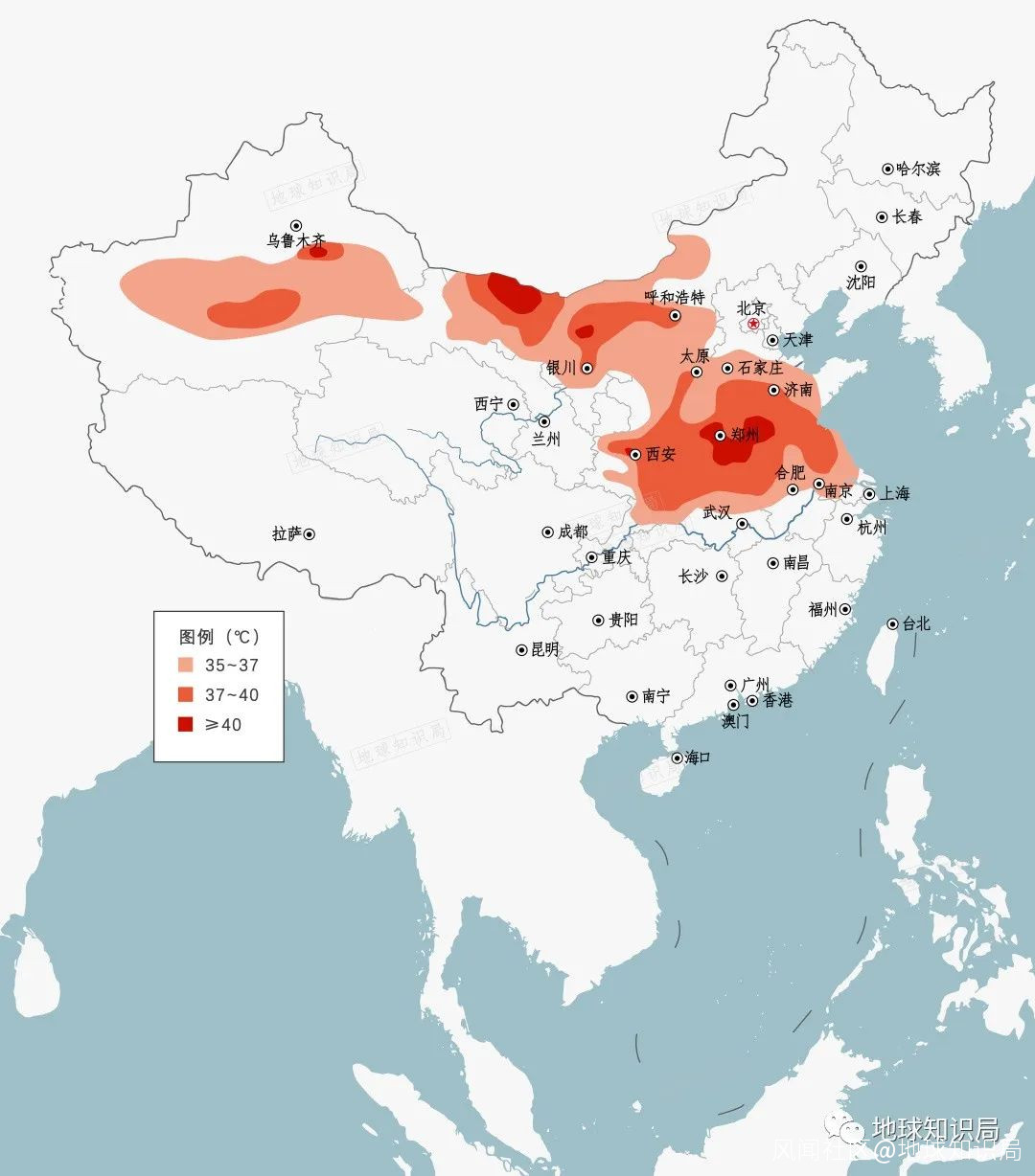 與持續東進、南下的暖高壓相伴隨,熱浪從西向東、從北向南蔓延,山西、河南、山東及蘇皖、關中盆地等地區出現持續性高温天氣,日最高氣温預計有35~38℃,局部地區可達40℃左右。河南中部形成高温中心,鄭州、漯河等地將會持續一週39-40度的高温天氣。20-21日暖脊控制了華北,北京市最高氣温可達35-36℃,空氣濕度大,體感悶熱。