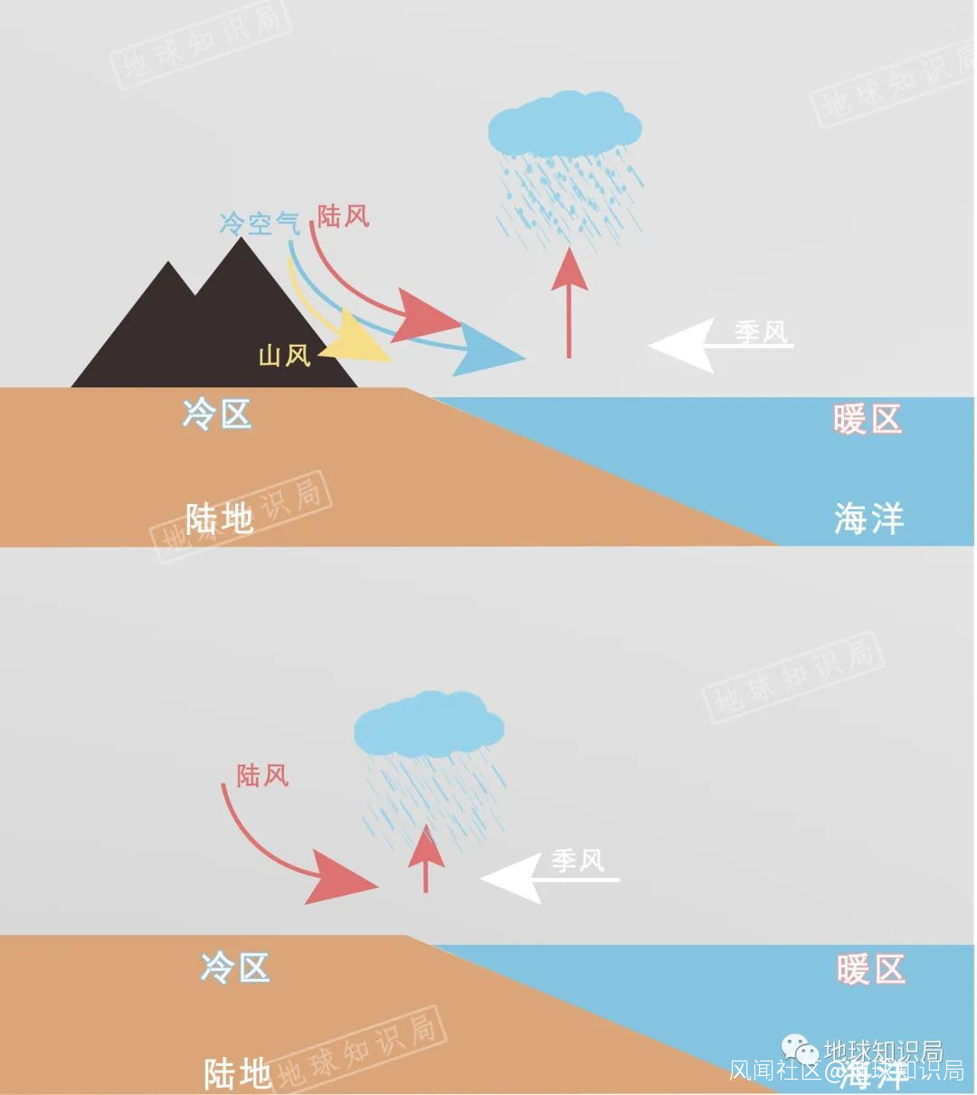 龍舟水的成因與南海夏季風活動密切相關,南海夏季風一般於5月中旬爆發北上,由於其來自熱帶海洋,表現為密度較輕且富含能量的暖濕氣團,其本身性質就不穩定,遇到合適的條件,比如南嶺等複雜地形的強迫垂直抬升運動、海陸風導致的局部輻合抬升,便可以觸發不穩定能量的釋放。