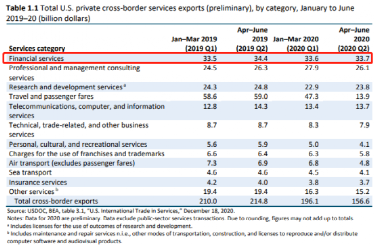 在美國服務貿易出口中,金融服務出口佔比最高,達到33.7%。尤其疫情以來,金融服務業已超越旅遊業,成為美國出口佔比最大的服務行業。