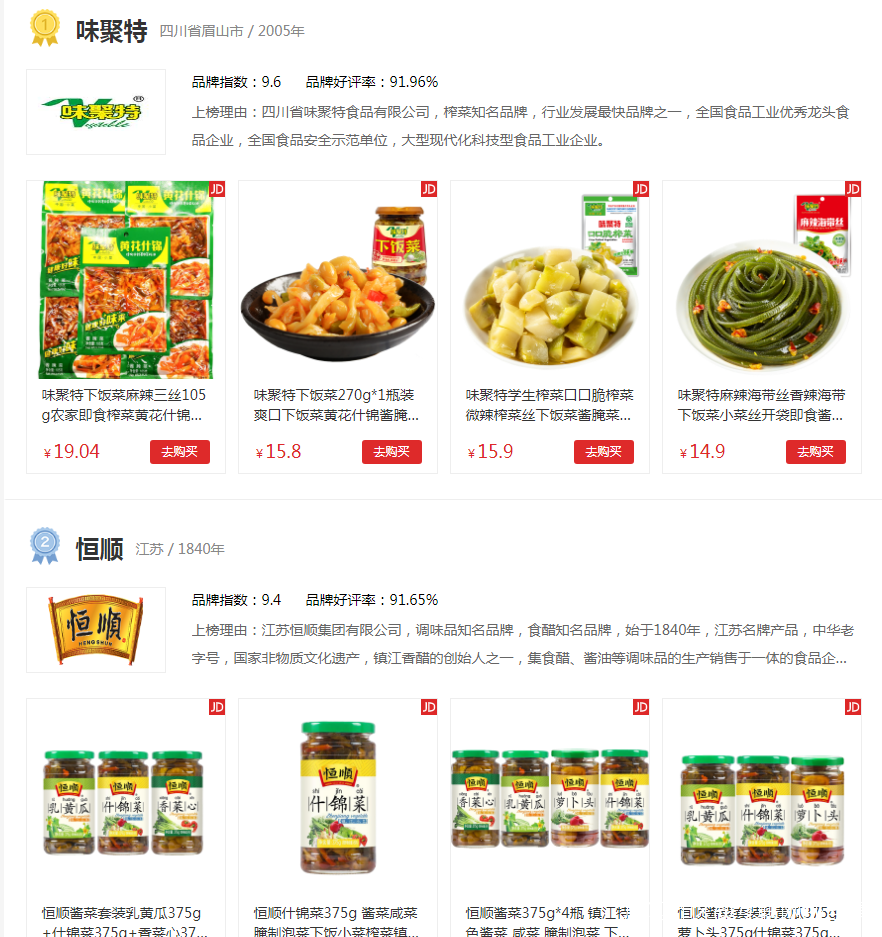 這不就是我們常吃的什錦菜嗎?根據排行榜123網依託全網大數據的什錦菜十大品牌排行榜顯示,恆順的品牌指數排名第二,招牌產品為瓶裝什錦菜、乳黃瓜、香菜心、蘿蔔頭,排名第一的味聚特主打產品為“麻辣三絲”。