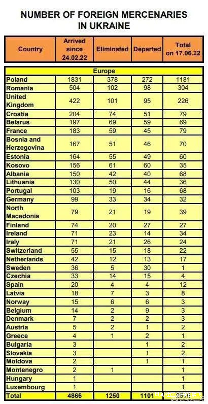 來自中國台灣的僱傭軍説最大的敵人是軍事能力低下的友軍,堪稱完美間諜,他們貪吃,總是隨地大小便和亂丟垃圾,總是抱怨,哪怕是挖自己的掩體也十分懶惰。喜歡連發,不待命令開火,敵我不明開火,這三種在夜間交戰是常態,經常對射半天發現是友軍,可笑的彼此都沒有傷亡。有個老人沒有死於俄羅斯槍下,而是死於烏克蘭國民衞隊,這個在這裏是常態。目前波蘭的僱傭軍最多,參與了1831人,波蘭政府説這些人跟他們無關,他們不知情。報表清楚的顯示了所有參與烏克蘭的僱傭軍人數,中國台灣省1名,然後日本、韓國少量,其他地區的僱傭軍(除了波蘭棉花絮沒去研究人家背後是不是被白左控制)的參與人數和總人口的比例大致跟白左在該國的控制人數比例息息相關,比例越高的説明白左控制水平越高,比如格魯吉亞之春後的格魯吉亞,比如波羅的海三國,比如小土豆的國家,當然白左控制水平較小的國家,比如匈牙利等就只有1人。這個説明了白左的媒體洗腦和政權控制取得了巨大的成功。