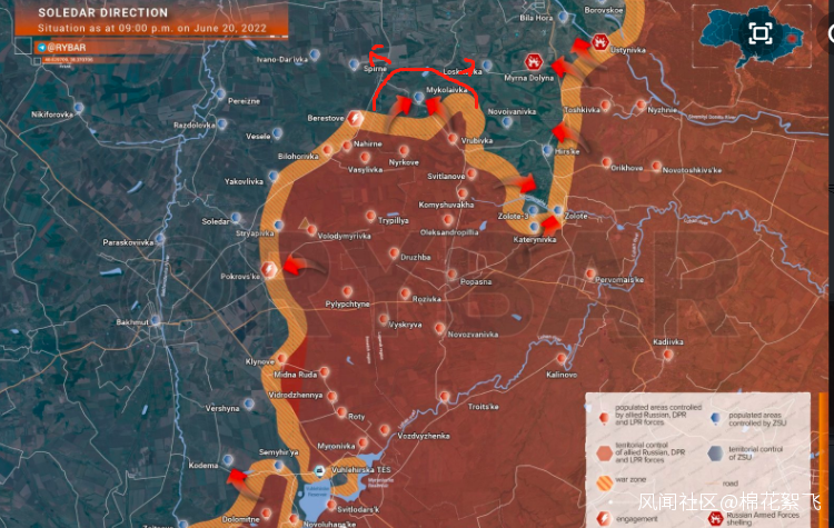 5、波帕斯納方向,俄羅斯加緊了對澤勒特、戈爾斯科耶的的圍攻,目前大炮轟炸的同時,試圖封鎖其北部口袋,託什基夫卡高地拿下後,俄羅斯繼續往利西昌斯克西側攻擊前進。