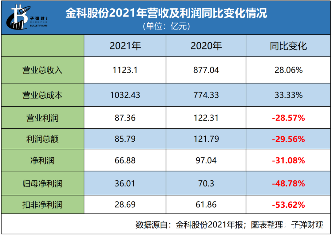 據金科股份2021年報顯示:全年實現營業收入1123.10億元,同比增長28.06%;營業利潤87.36億元,同比下降28.57%;淨利潤66.88億元,同比下降31.08%;而歸母淨利潤只有36.01億元,同比跌幅更是達到了48.78%。
