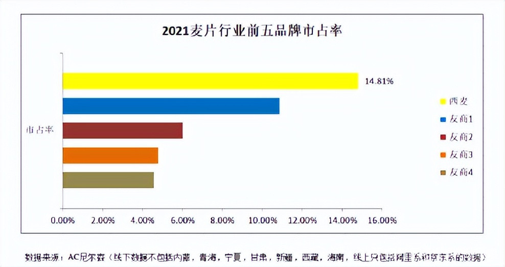 作為燕麥產業裏的龍頭,西麥食品一直穩紮穩打構建渠道壁壘,對線上線下雙渠道均衡化佈局,讓自己儼然已成為“渠道優等生”,這在全球知名的市場調研公司AC尼爾森監測到的“2021年麥片行業前五品牌市佔率”數據中得到了體現。