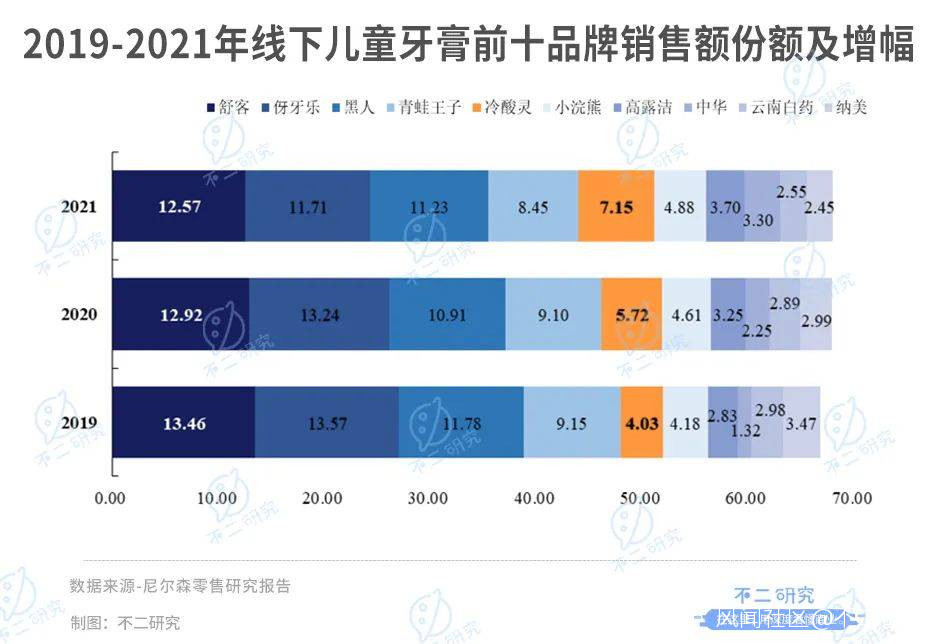 雖然在細分領域中擁有過半的市場份額,但抗敏仍是較小眾需求,在整個牙膏市場中佔比並不大。據尼爾森零售研究數據,抗敏感類牙膏2021年的線下市場份額佔比僅為10.65%,不及牙齦護理、美白細分市場的一半。