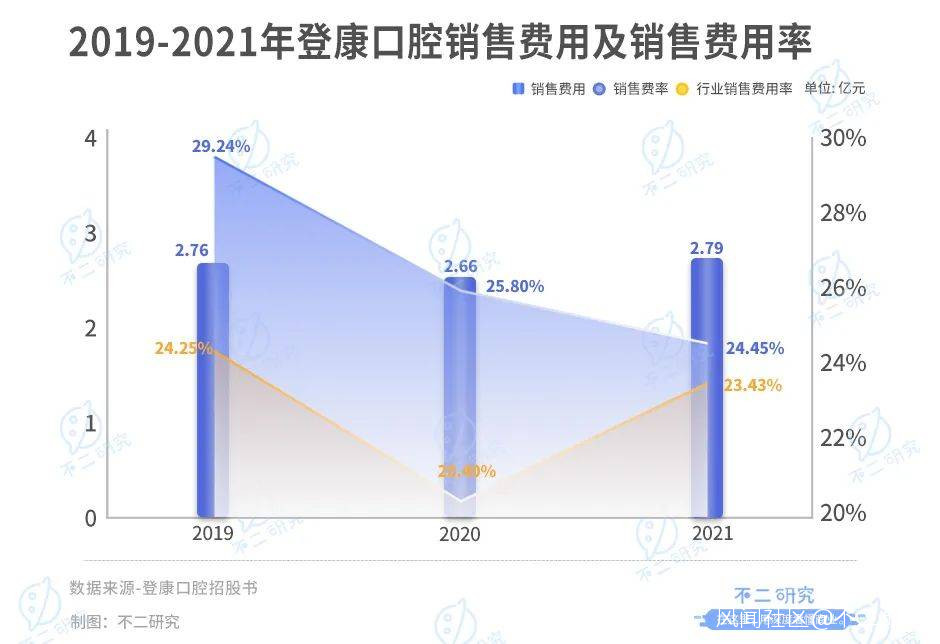 「不二研究」認為,營銷開支過高成為拖累淨利率的主要因素。招股書顯示,2019年-2021 年,登康口腔的銷售費用分別為2.76億、2.66億和2.79億元,銷售費用率分別達到29.24%、25.80%和24.45%。同期,行業銷售費用率平均值分別為24.25%、20.40%和23.43%;中位數分別為14.32%、15.13%和12.24%,均低於登康口腔。