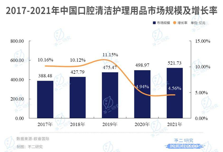 目前,國內口腔護理市場已經進入存量競爭的局面。根據歐睿國際數據,2020年-2021年,我國口腔清潔護理市場規模同比增速大幅下降,分別為4.94%及4.56%,2021年的市場規模僅為521.73億元。