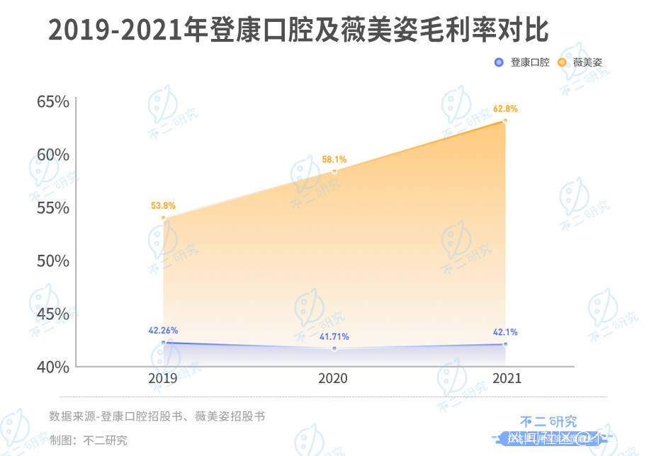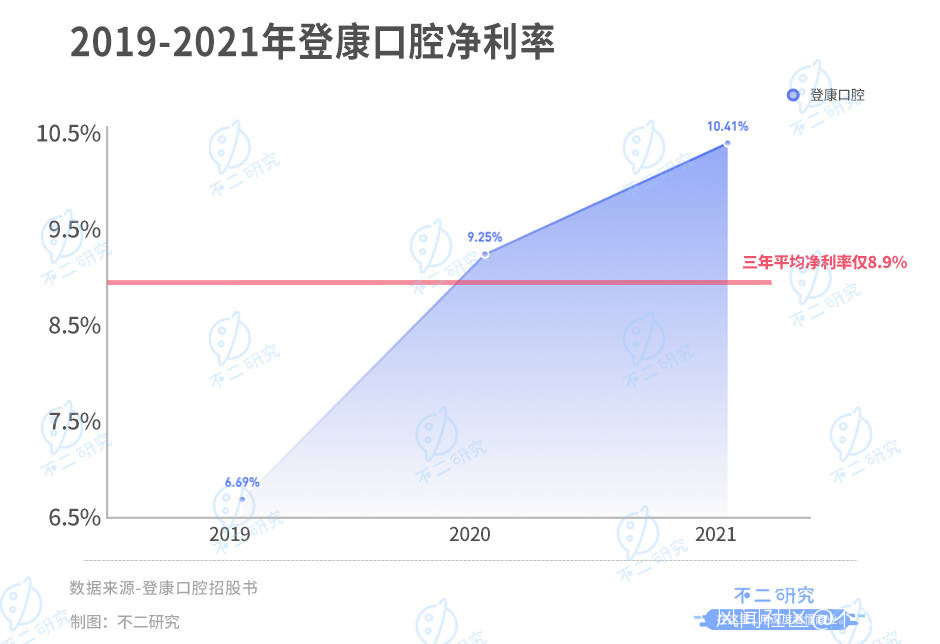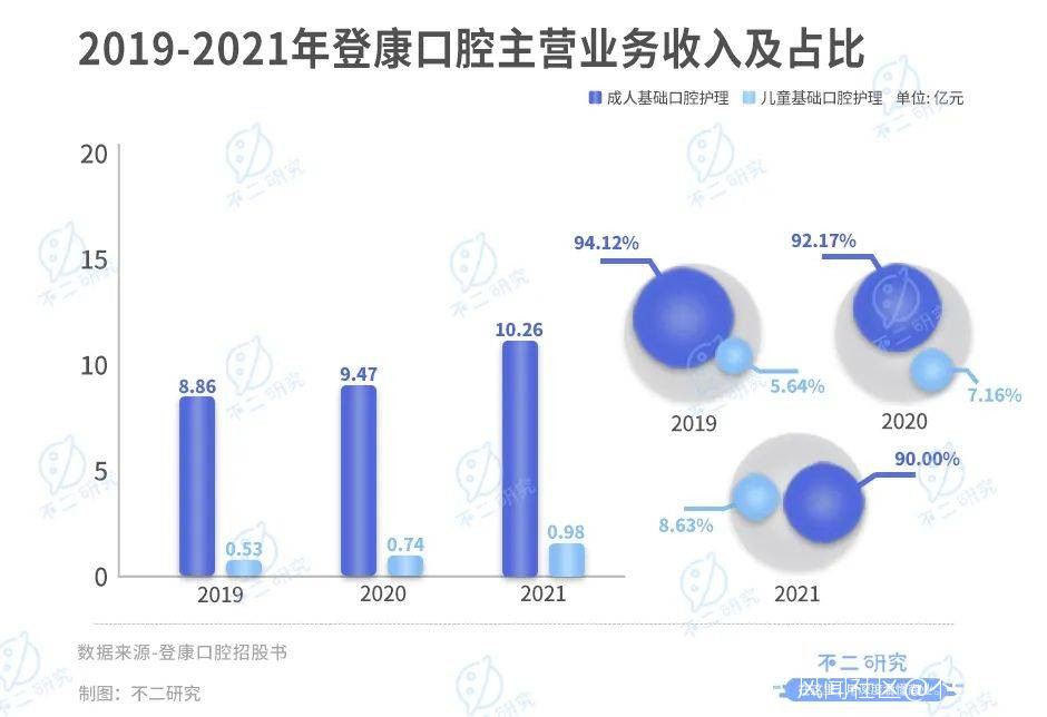 「不二研究」發現,登康口腔的營收正處於平穩增長中。招股書顯示,2019年-2021年,登康口腔營業收入分別為9.44億、10.30億和11.43億元,其中2020年和2021年增速分別為9.08%、10.97%。