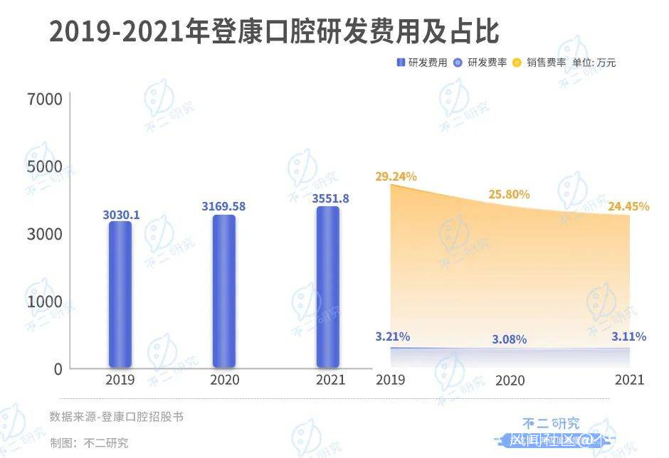儘管在冷酸靈八十週年慶典上,董事長鄧嶸表示將持續發力“研發+推廣”,但事實上登康口腔在研發上的投入並不算多。招股書顯示,2019年-2021年,登康口腔的研發費用分別為3030.1萬元、3169.58萬元和3551.8萬元,對應的研發費用率為3.21%、3.08%和3.11%,與銷售費用率對比鮮明。
