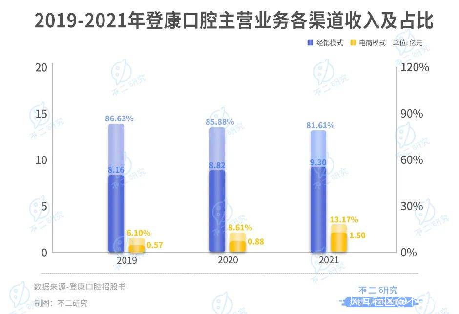 據招股書,2019年-2021年,登康口腔經銷模式收入分別為8.16億、8.82億和9.30億元,佔比分別為86.63%、85.88%及81.61%。電商模式雖在發展,但2021年電商的收入佔比只有13.17%。