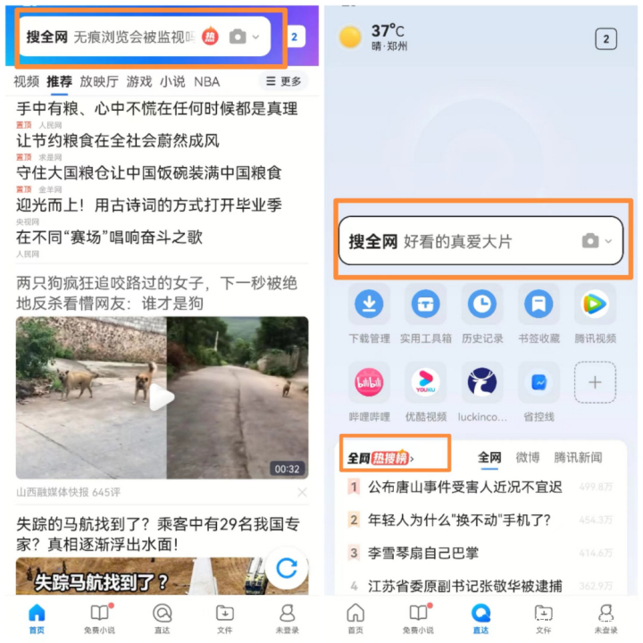 為了留住用户的心,QQ瀏覽器開始挽回形象,推出“直達-搜索”功能,並放在了底部欄的中心位置,以期實現快捷和高效。