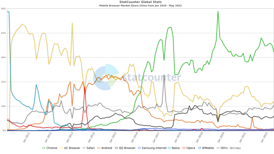 360瀏覽器早年的崛起就是個典型。儘管起步較TT瀏覽器晚,但仍然憑藉着安全軟件的背景,明確主打“安全”定位,迅速切下了一塊市場蛋糕。隨後360瀏覽器的份額穩步攀升,而TT瀏覽器則逐步走低。