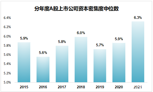 從A股上市公司的數據來看,2021年中位數的資本密集度度為6.3%,這個數字總體並不高,因為我們A股上市公司營業收入中折舊攤銷的佔比,在2021年平均是5.6%,這代表上市公司總體的資本開支,剛剛好能夠覆蓋折舊攤銷這種維持簡單再生產所需要的水平。