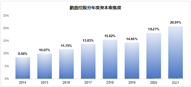 分年度看,鵬鼎控股的資本密集度總體是在增加的,顯示公司的資本開支強度每年都在增加。