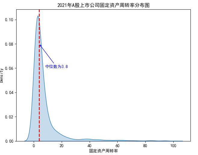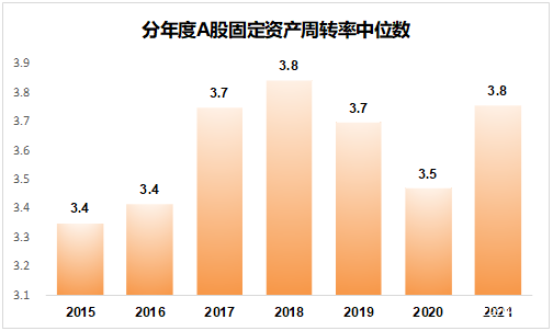 從分佈上看,固定資產週轉率的中位數與分佈的最高點非常接近,也就是説,A股一個普通的上市公司,每一塊錢的固定資產,可以撬動3.8元的營業收入。