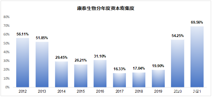 尤其康泰生物,雖然股價一路向下,但至少從財務指標上看,收入和淨利潤都在往上走,這兩年資本開支強度也屢創新高,2021年54%,2021年報高達70%。