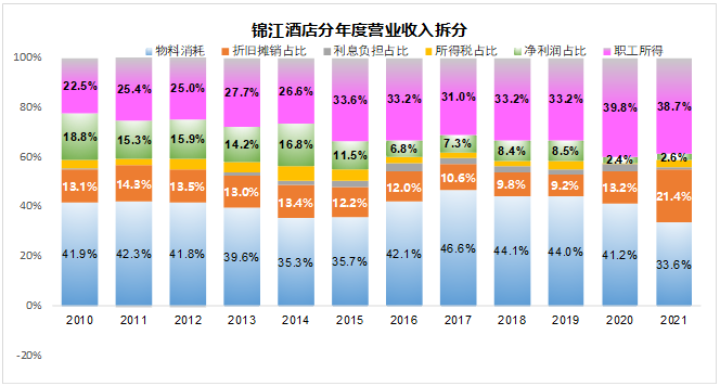 錦江酒店這些年折舊攤銷一般都能佔到營業收入的10%左右,員工薪酬則佔到30%,首旅酒店的表現與錦江基本一致。