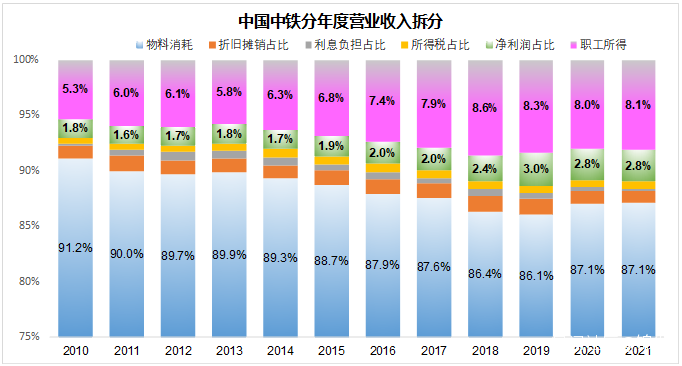 我們以中國中鐵為例(不選中國建築因為公司房地產業務比例太高),從過去12年的數據看,員工薪酬在營業收入中的佔比一般在10%以下,利潤率比較薄,通常不到3%。