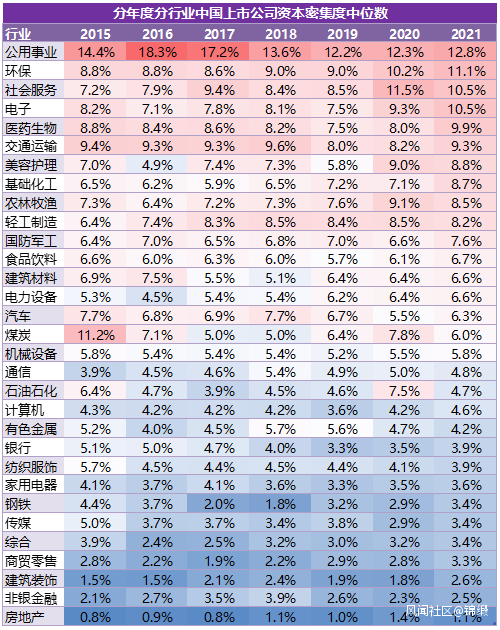 房地產需要單獨出列。這個行業買地的費用,通常會反應在存貨裏,體現在“購買商品、接受勞務支付的現金”項下,不屬於資本開支,因此資本開支的中位數也非常低。
