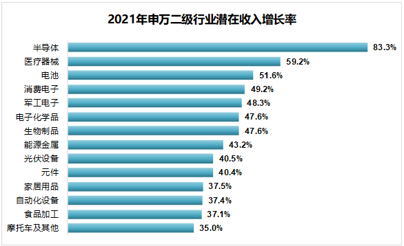 在我們排除那些人力資源推動型、項目推動型以及資本金推動型行業之後,我們從二級行業角度,找出了2021年行業中位數潛在收入增長率大於35%的14個行業,如上圖。