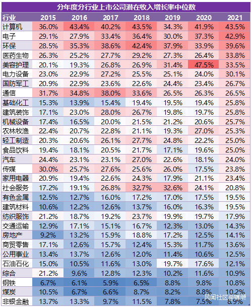 根據各個年度的數據,我們推算出的全部上市公司收入潛在增長率的中位數如上圖。總體上看,這個數字基本上在20%-26%之間,2021年這個數據稍有跳升,為25.8%。