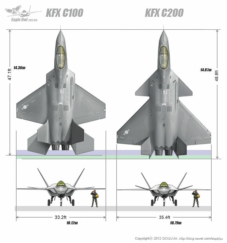 ADD基於C103進行標準化設計,增加了保型天線,推出了外觀幾乎相同的C104構型。2016年DAPA選定通用電氣F414發動機作為KF-X的動力,更充沛的推力使KF-X得以放大尺寸,誕生了C105構型,翼展增加了0.3米,機長增加0.4米,主翼和平尾面積增大,降低的翼載荷增強了機動性。進氣道擴大以適應F414的進氣流量,座艙蓋、前機身和垂尾機身耦合結構也進行了優化,前起落架改為向後收起,顯示內部設備佈置發生了變化。