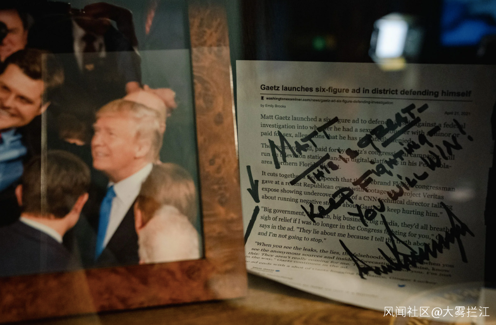 蓋茲的國會辦公室裏醒目地擺放着川普的一張便條。