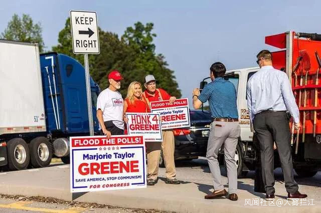 這是佐治亞州西北部一個陽光明媚的日子,我和格林坐在她的競選越野車後座上聊天,車上裝滿了能量飲料、Advil止痛片和格林最喜歡的花生M&M豆。她正在為5月24日的初選造勢,她很快就會輕鬆贏得初選。格林在華府可能不受人待見,但她在這裏很受歡迎。在初選中,她與五位共和黨挑戰者競爭,他們在競選中都主張減少分歧。其中一位得到了華府共和黨建制派的支持。結果格林獲得了70%的初選選票,以50個百分點的優勢獲勝。
