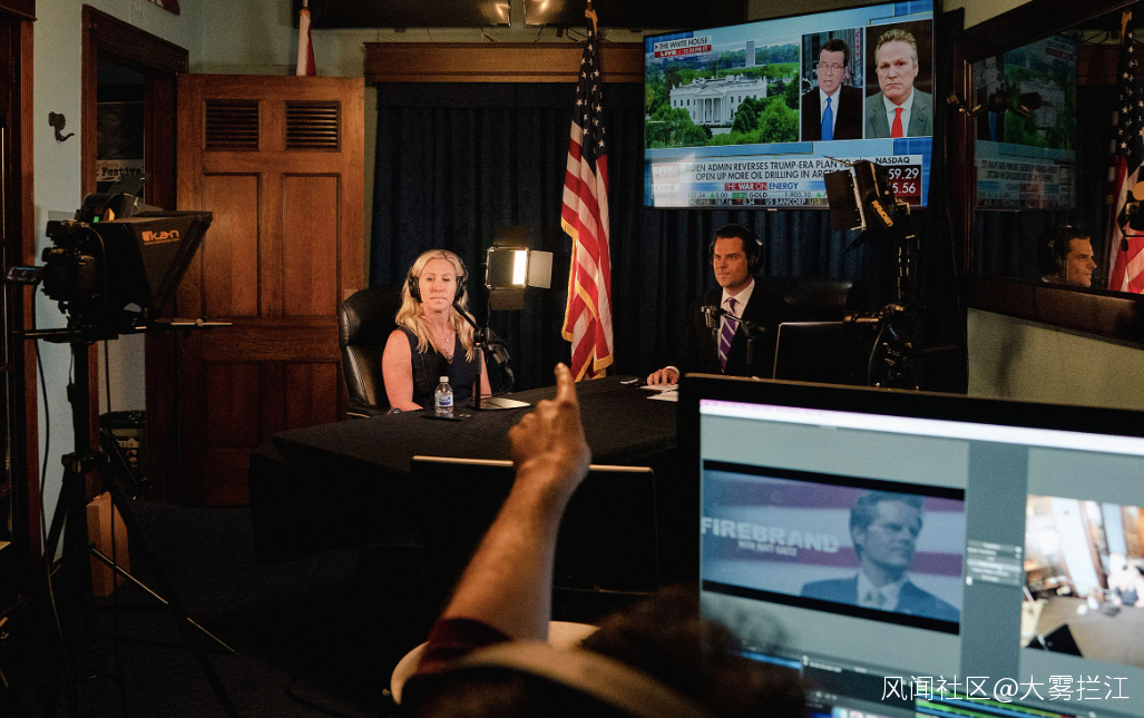4月下旬一個週二的下午,眾議員瑪喬麗·泰勒·格林(Marjorie Taylor Greene)走進眾議員馬特·蓋茲(Matt Gaetz)位於七樓的國會辦公室,坐在一張高背黑色皮革椅子上,金色的頭髮上戴着一副耳機。蓋茲的播客“Firebrand”的第38集即將開始錄製,格林是一位頻繁出現的客串明星。