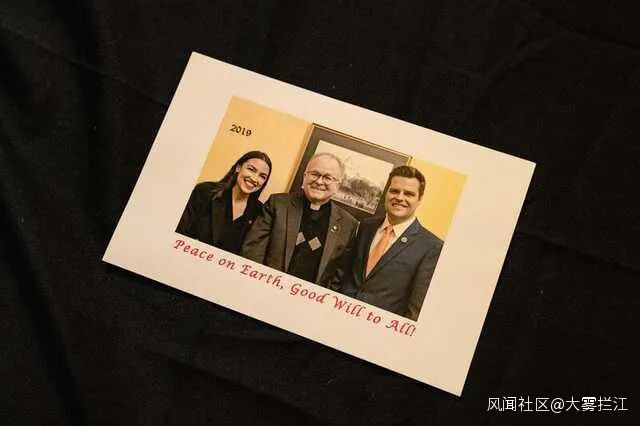 馬特·蓋茲最喜歡的紀念品之一是與亞歷山大·奧卡西奧-科爾特斯(AOC)的合影,她是來自紐約的自由派國會女議員,也是全美政界的名人。在照片中,他們穿着國會議員的服裝,笑容滿面地站在耶穌會牧師兼眾議院牧師帕特里克·康羅伊神父的兩側,他讓他們為他2019年的聖誕賀卡擺姿勢。(格林最近指責天主教會協助移民的工作是被“撒旦控制”。)“地球和平,人皆持善!”照片下面用紅色字體寫道。